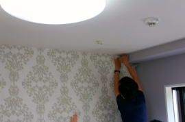 | 天井から床に向かって貼っていきます | 切込みを入れて壁紙をカットしていきます |